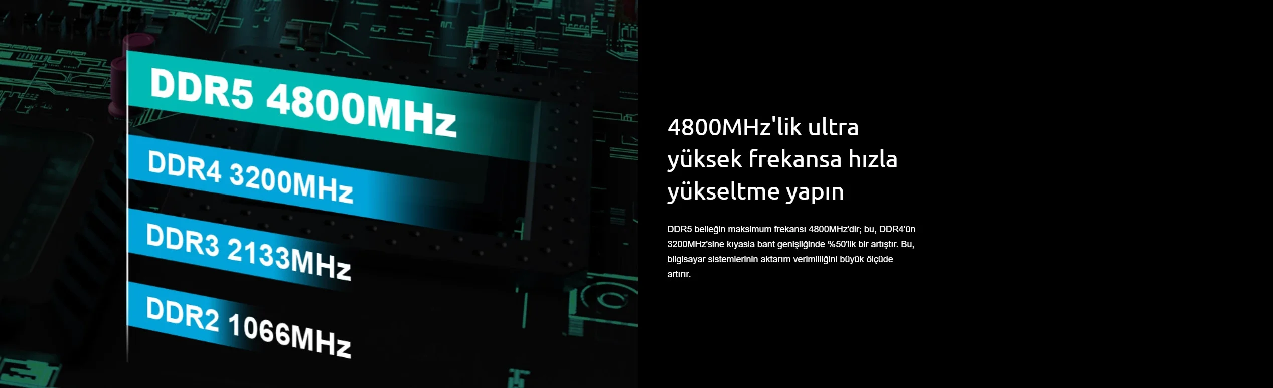 DDR5 belleğin maksimum frekansı 4800MHz'dir; bu, DDR4'ün 3200MHz'sine kıyasla bant genişliğinde %50'lik bir artıştır. Bu, bilgisayar sistemlerinin aktarım verimliliğini büyük ölçüde artırır.