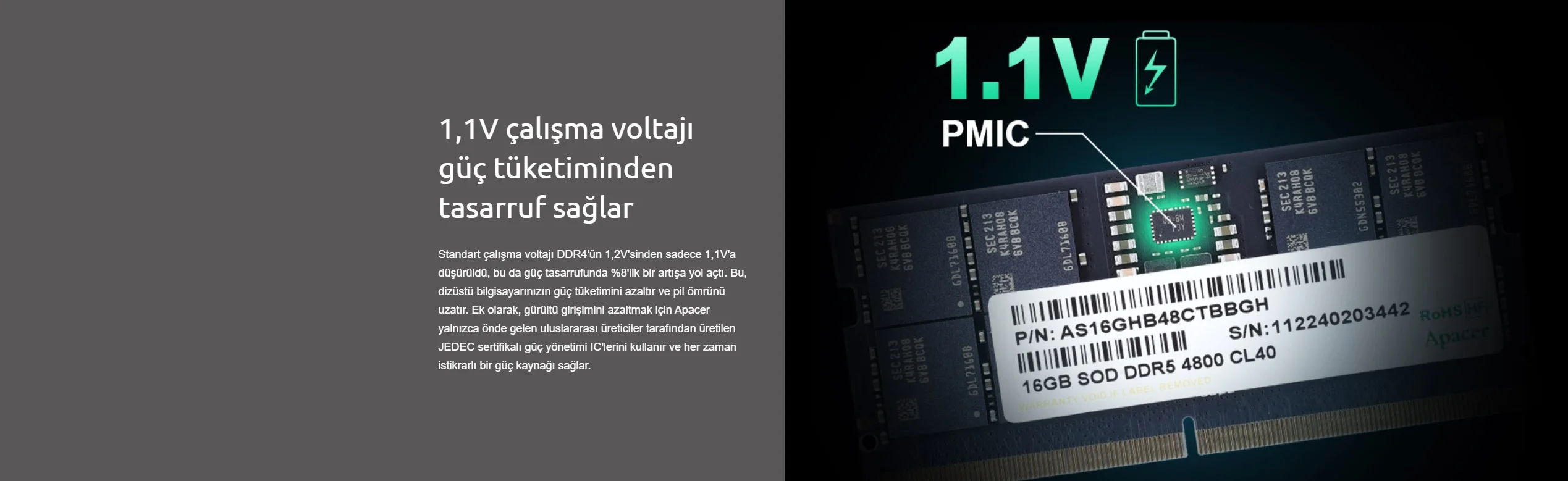 Standart çalışma voltajı DDR4'ün 1,2V'sinden sadece 1,1V'a düşürüldü, bu da güç tasarrufunda %8'lik bir artışa yol açtı. Bu, dizüstü bilgisayarınızın güç tüketimini azaltır ve pil ömrünü uzatır. Ek olarak, gürültü girişimini azaltmak için Apacer yalnızca önde gelen uluslararası üreticiler tarafından üretilen JEDEC sertifikalı güç yönetimi IC'lerini kullanır ve her zaman istikrarlı bir güç kaynağı sağlar.