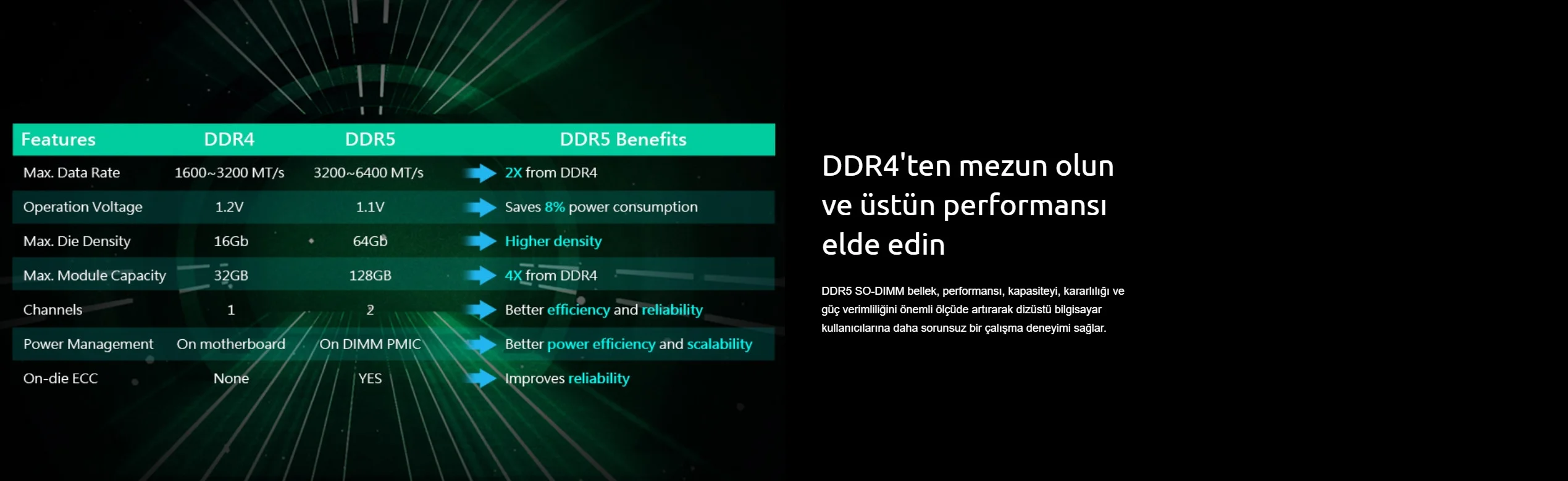 DDR5, minimum 8 GB ve maksimum 128 GB kapasiteyle DDR4'ün iki katı banka sayısına sahiptir. Bu, bellek kapasitesini artırarak bilgisayarınızın gecikme olmadan çoklu görev yapmasına olanak tanıyarak çalışma verimliliğini ve depolama performansını önemli ölçüde artırır.