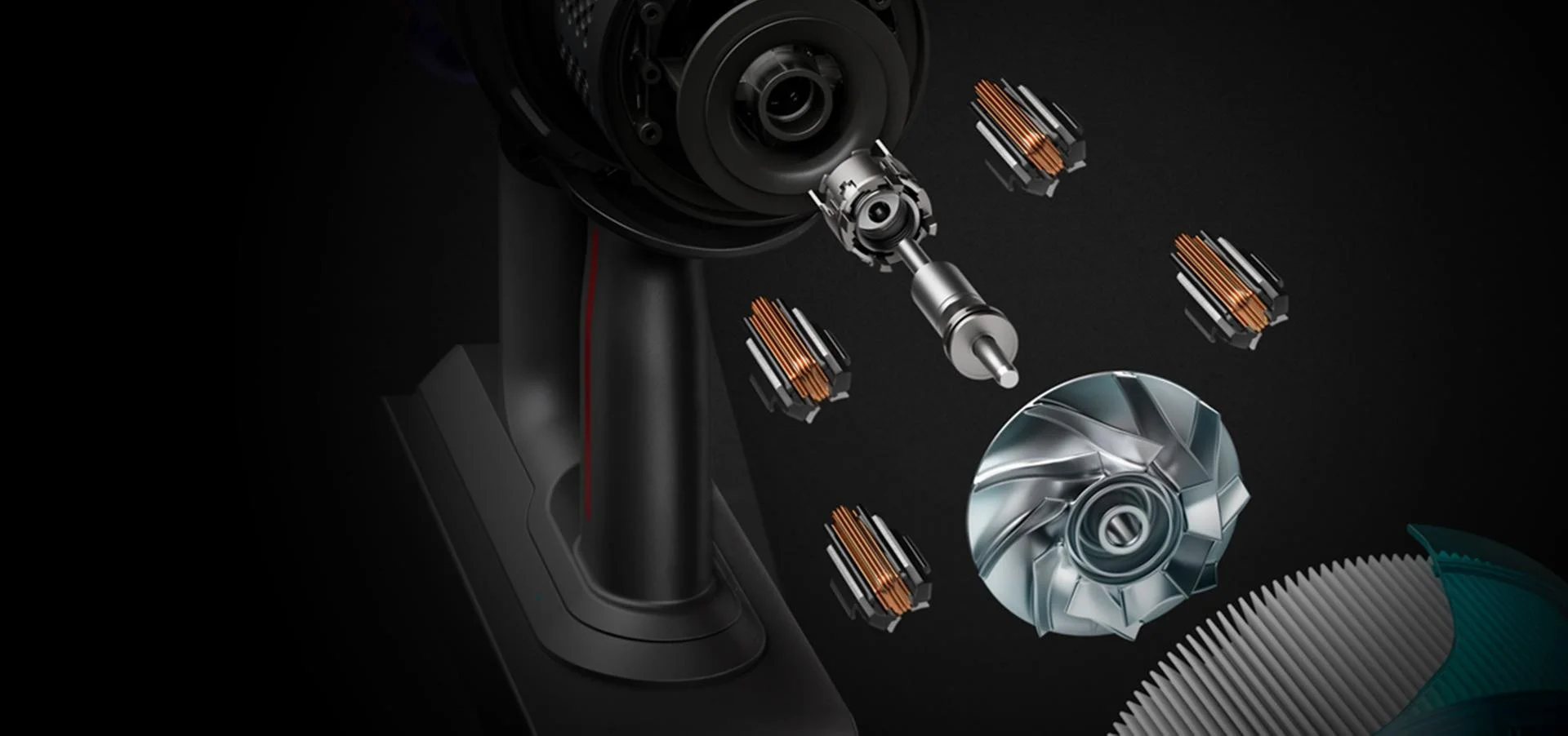 Şimdiye kadarki en güçlü motorumuz. Dyson'ın en yüksek emiş gücünü üretmek için dakikada 135.000 devire kadar döner.