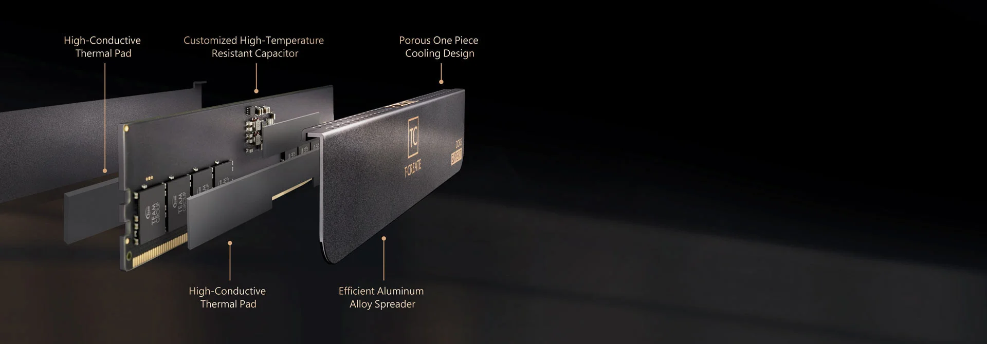 Masaüstü bellek, kararlılığı ve performansı en üst düzeyde sunmak için havalandırma delikleri ve profesyonel termal iletken silikonla kaplı özel tek parça soğutma modülü kullanır. Dahası, akımın yüklemeye sorunsuz bir şekilde iletilmesini sağlayan Güç katmanı; sinyalleri herhangi bir müdahale olmadan ileten GND katmanı ve her ikisi de 10 katmanlı baskılı devre kartından özel olarak izole edilmiştir. Özelleştirilmiş yüksek sıcaklığa dayanıklı kapasitör, alüminyum ısı yayıcı ve yüksek kaliteli IC ile birleştirilen T-CREATE EXPERT DDR5, büyük dosyalar çalıştırıldığında bile kararlı bir sistem sağlar ve yaratıcıların yaratıcılıklarını serbest bırakmalarını sağlar.